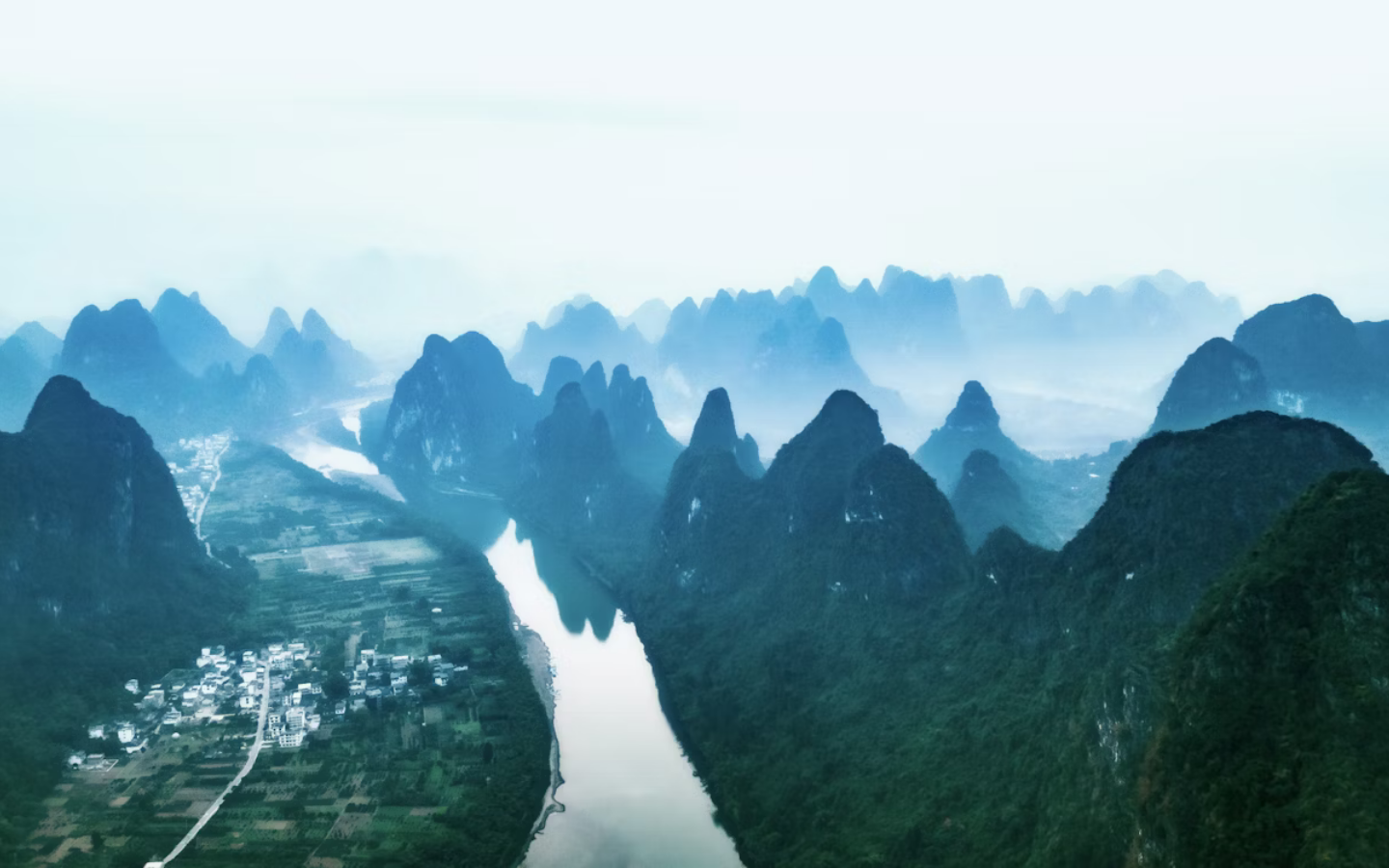 Spring rain nourishes the Li River, while clouds and mist surround the peaks and forests, creating a vivid ink painting.