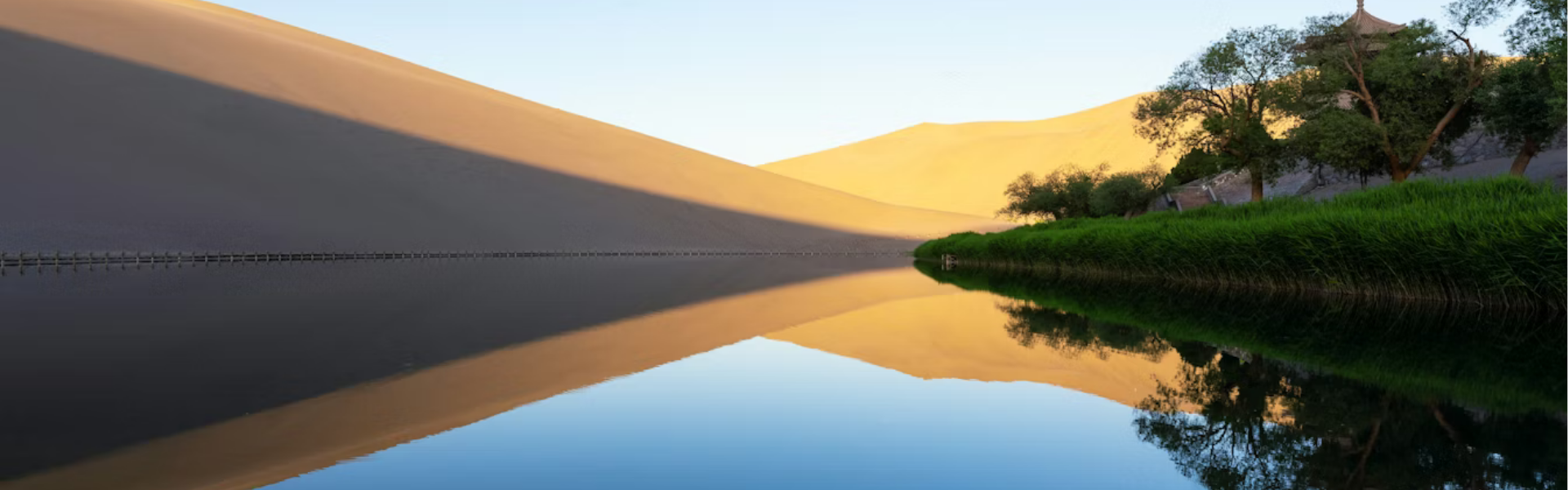 In the endless desert, there is a clear spring, which is the Yueya Spring(Yueya, in Chinese, refers to the shape of a crescent moon). The water is clear and beautiful, and does not dry up for thousands of years.